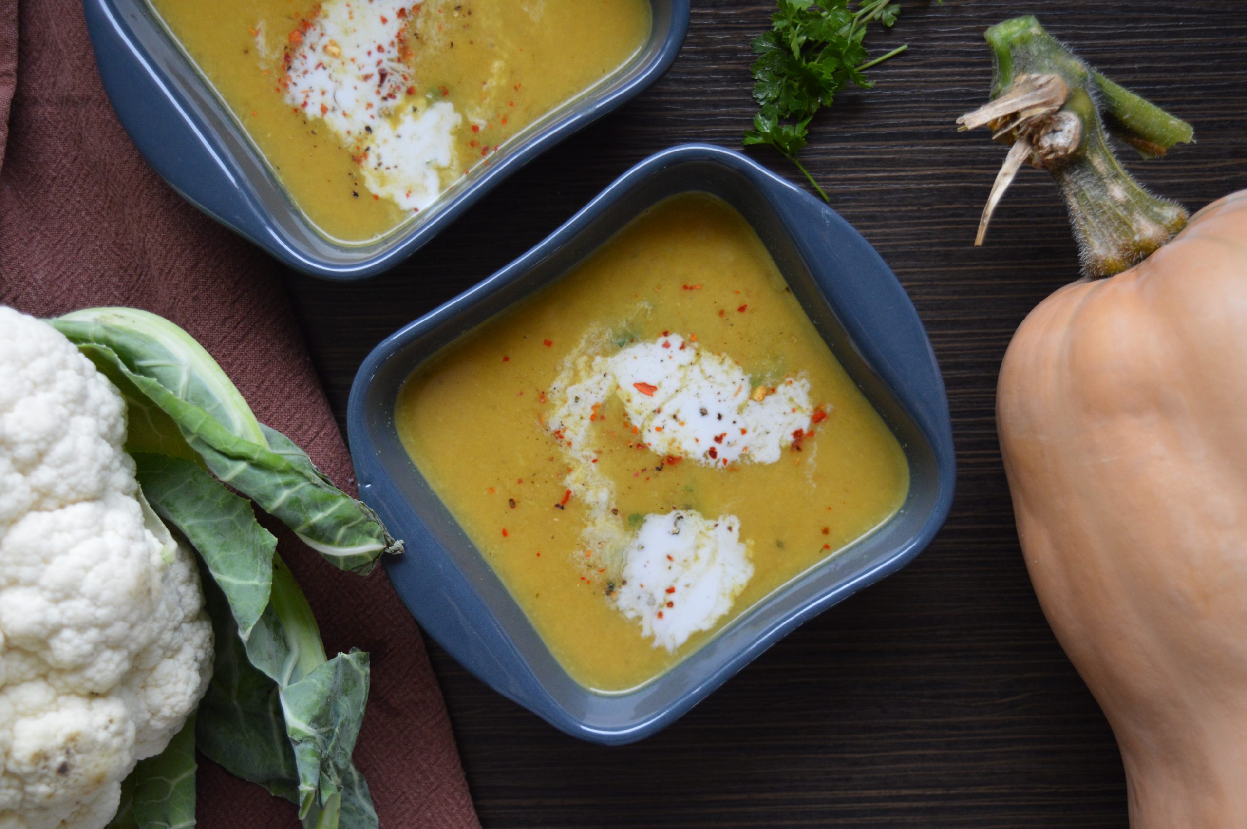 - Iseckati karfiol na cvetiće, pa ga pomešati sa začinima i lukom zajedno sa pečenom bundevom i 500ml vode.