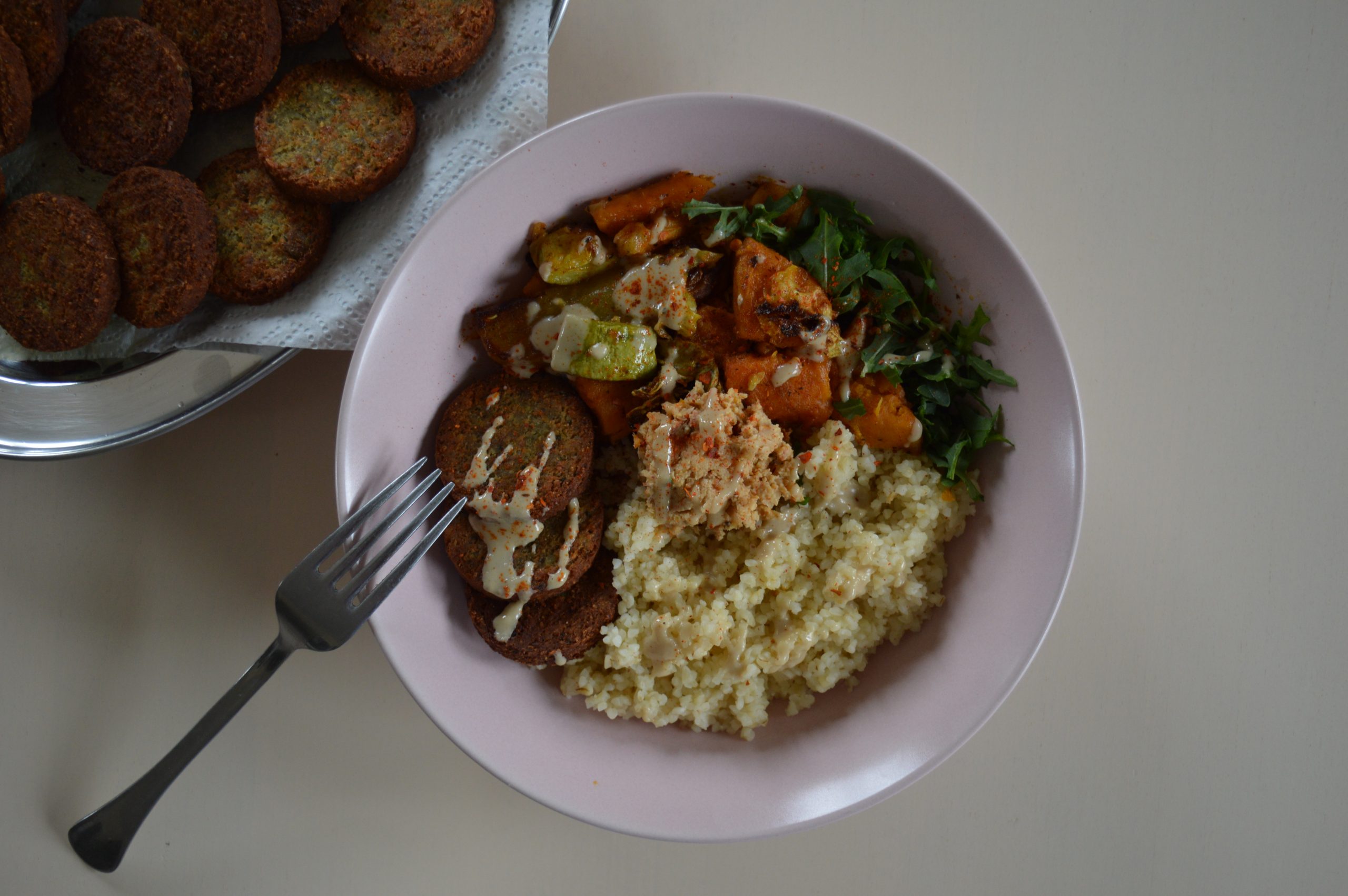- Falafel, skuvani bulgur, humus, rukolu i šargarepu rasporediti po tanjiru, preliti sosom od tahinija i tucanom paprikom.