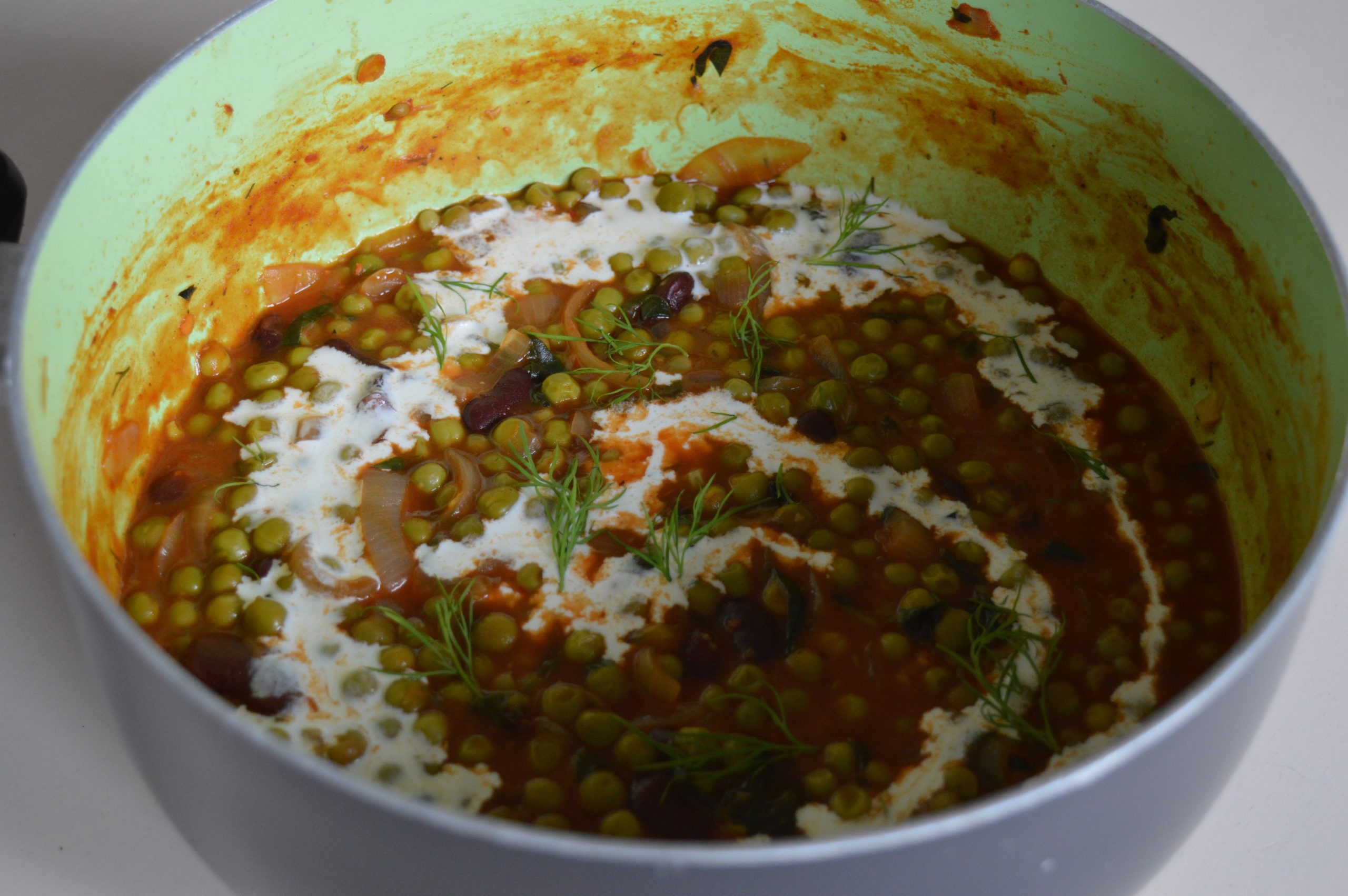 - Dodajte zamrznuti grašak i 200ml vode, kada proključa, smanjite vatru na pola, dodajte paradajz pelat i začine i ostavite da se krčka 15ak minuta.