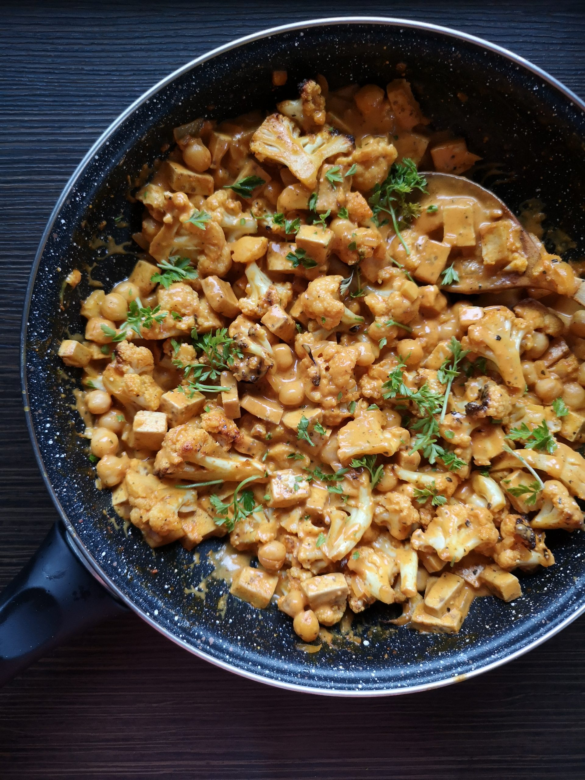 - Izvadite tofu i karfiol iz rerne I zajedno sa leblebijama umešajte u preliv.