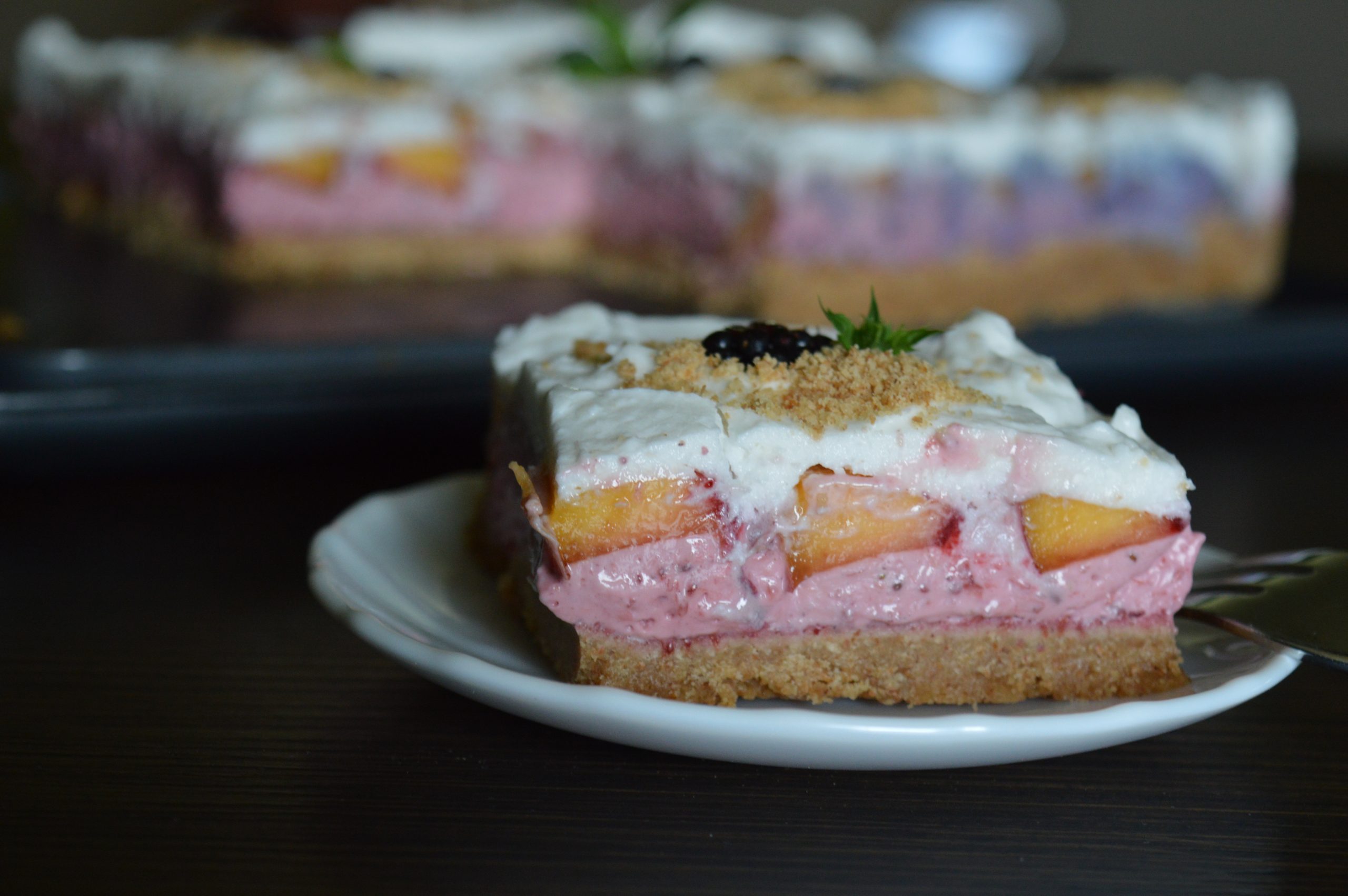 - Mikserom izmešajte šlag i vodu, ravnomerno ga rasporedite po breskavama. Odložite tortu u frižider na 4-5h ili preko noći.