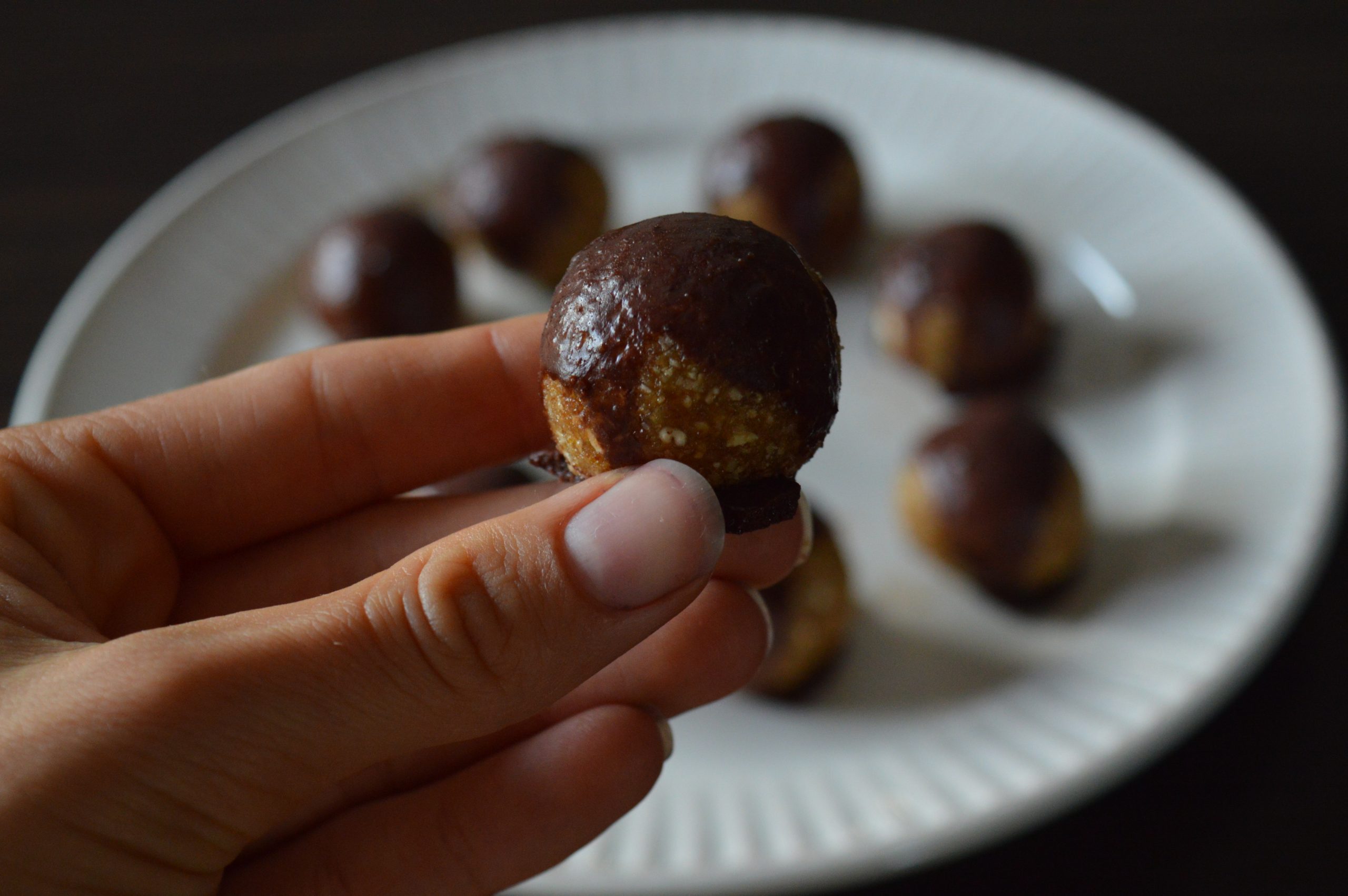 - Uvaljati svaku kuglicu u čokoladu ili preliti od gore i odložiti u frižider na 15ak minuta dok se čokolada ne stegne.