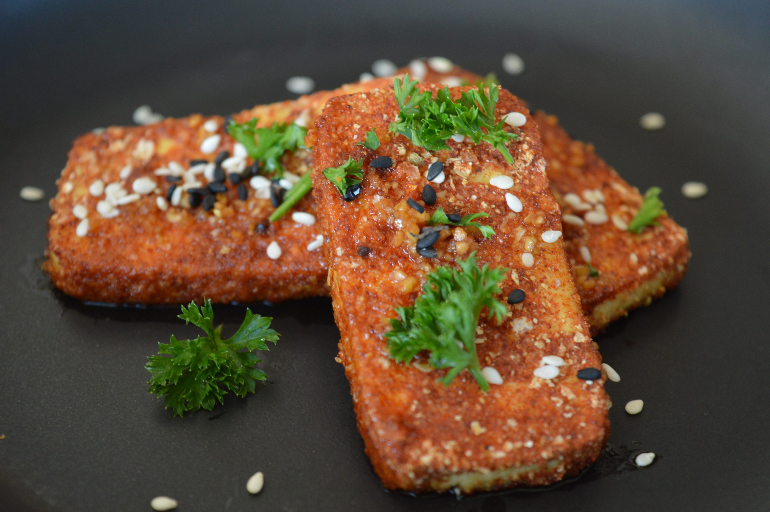 - Pomešati brašno od leblebije sa svim začinima i svaku šnitu tofu sira uvaljati u ovaj miks.